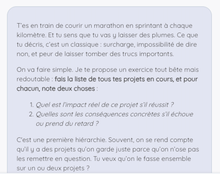 Exemple 1 : "j'ai trop de projets en même temps, je ne sais plus comment prioriser, j'ai peur de ne pas respecter mes deadlines et en même temps je ne peux laisser aucun projet à l'abandon..."