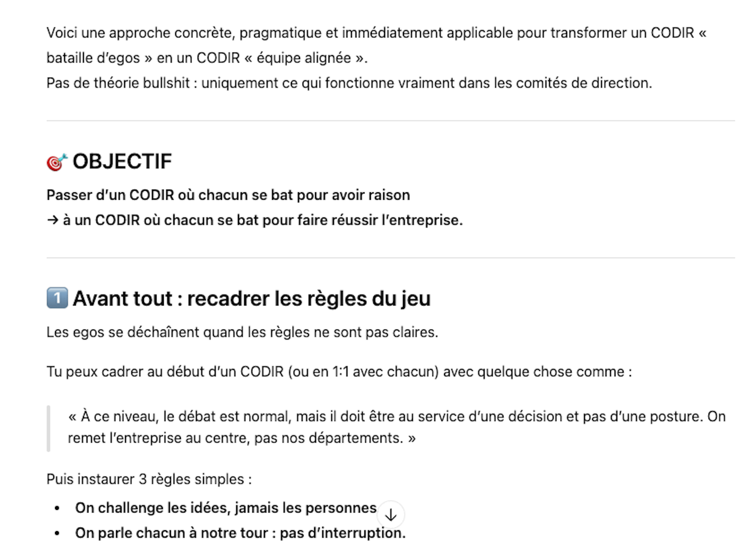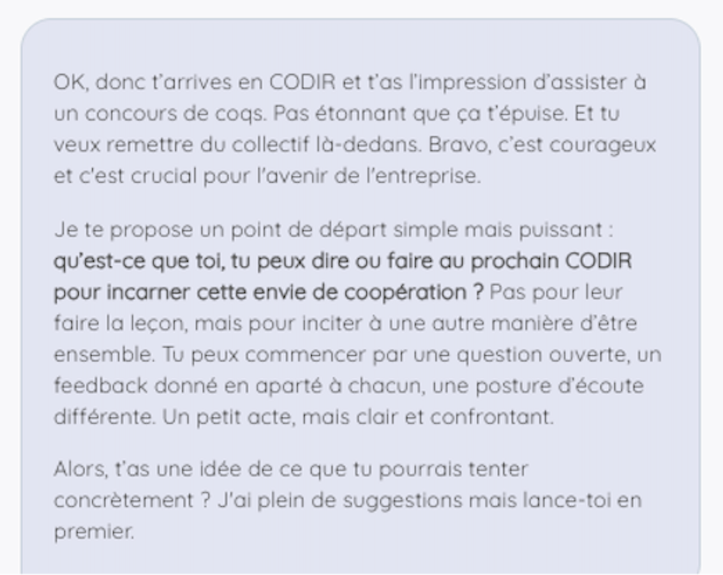 Exemple 2 : "ma dernière réunion de CODIR a été une bataille d'egos sur-dimensionnés. Je veux changer cela pour qu'on travaille vraiment ensemble. Que me suggères-tu ?"